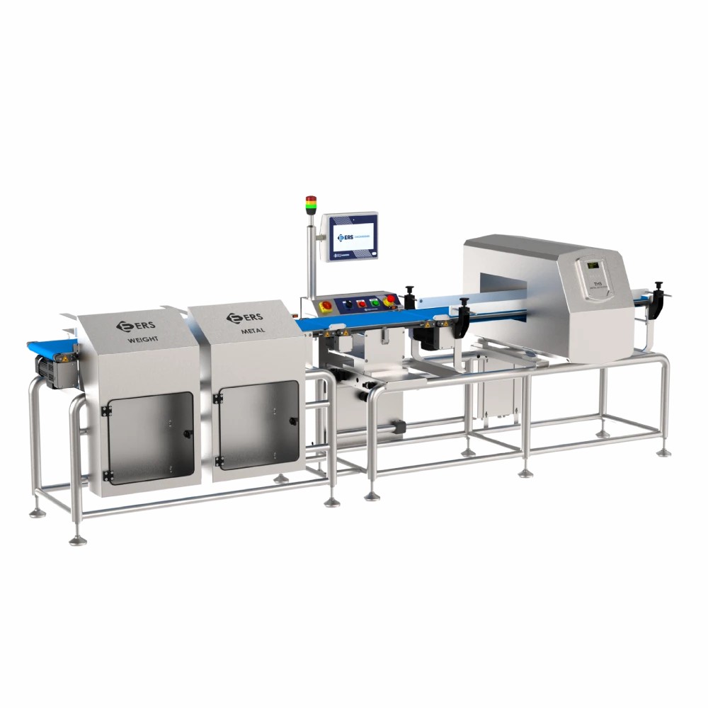 - Прецизионное взвешивание: Система динамического взвешивания (чеквейгер) обеспечивает высокую точность измерения веса продукции на скорости конвейера, что позволяет отбраковывать недовес или перевес.