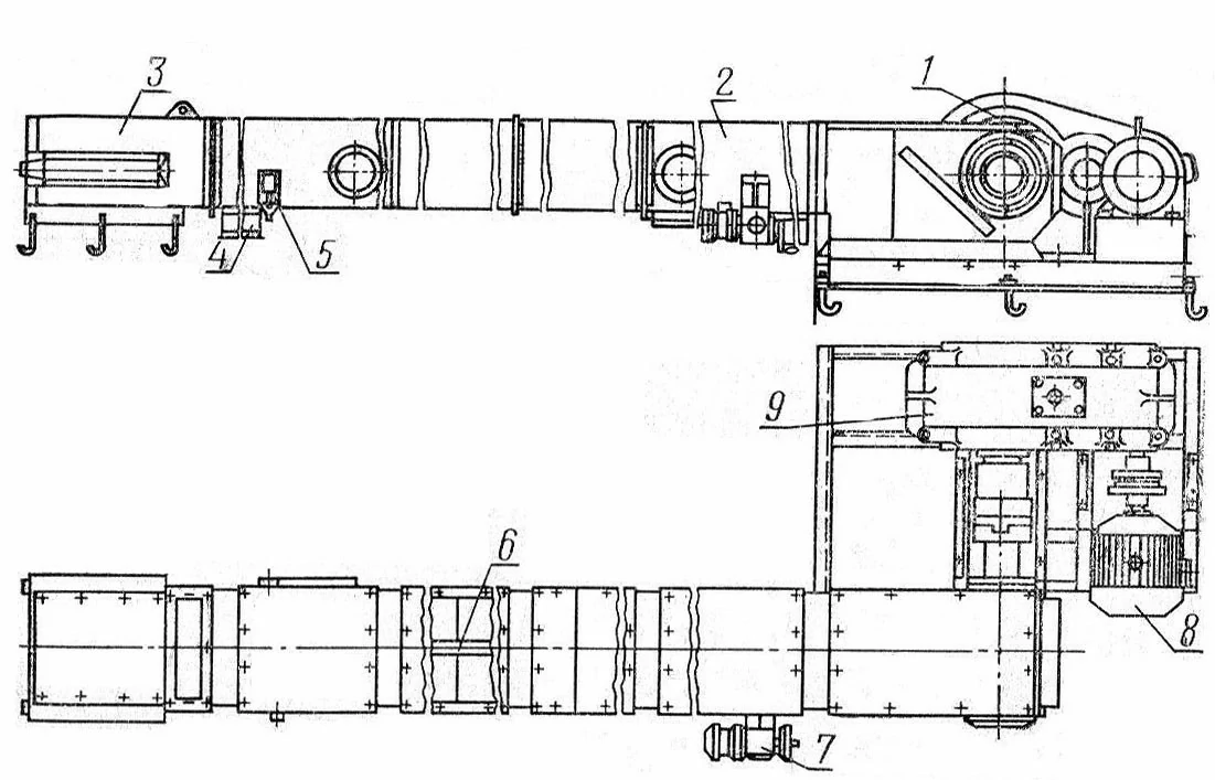 1-приводная станция; 2-разгрузочная секция; 3-натяжная станция; 4-выпускной патрубок; 5-конечный выключатель; 6-цепь транспортерная пластинчатая скребковая; 7-исполнительный механизм; 8-электродвигатель; 9-редуктор.